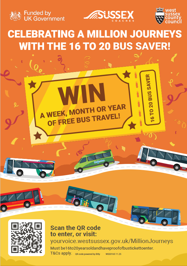 To celebrate a million journeys using the West Sussex County Council Young Persons travel scheme, you can win up to a years free bus travel!